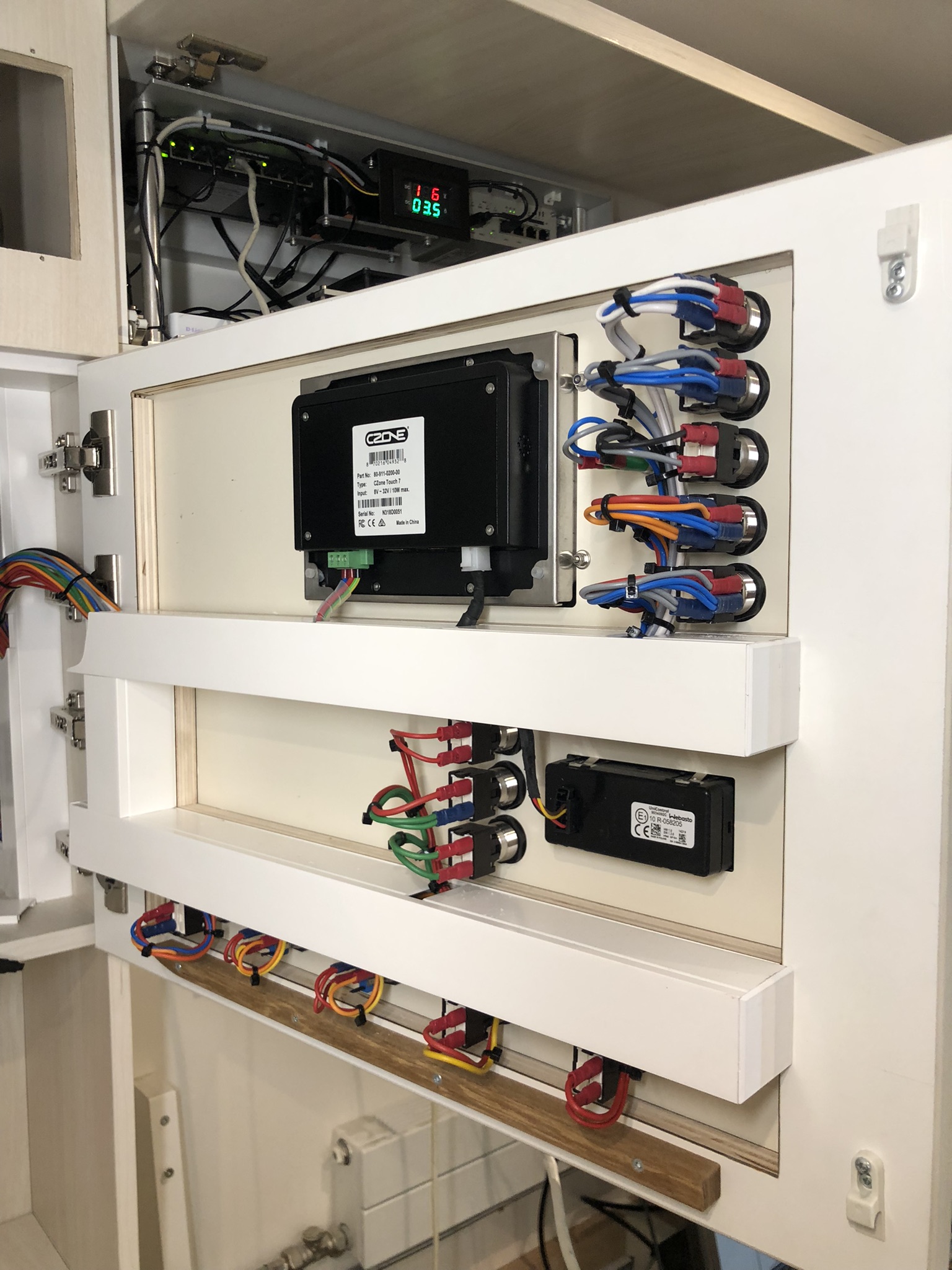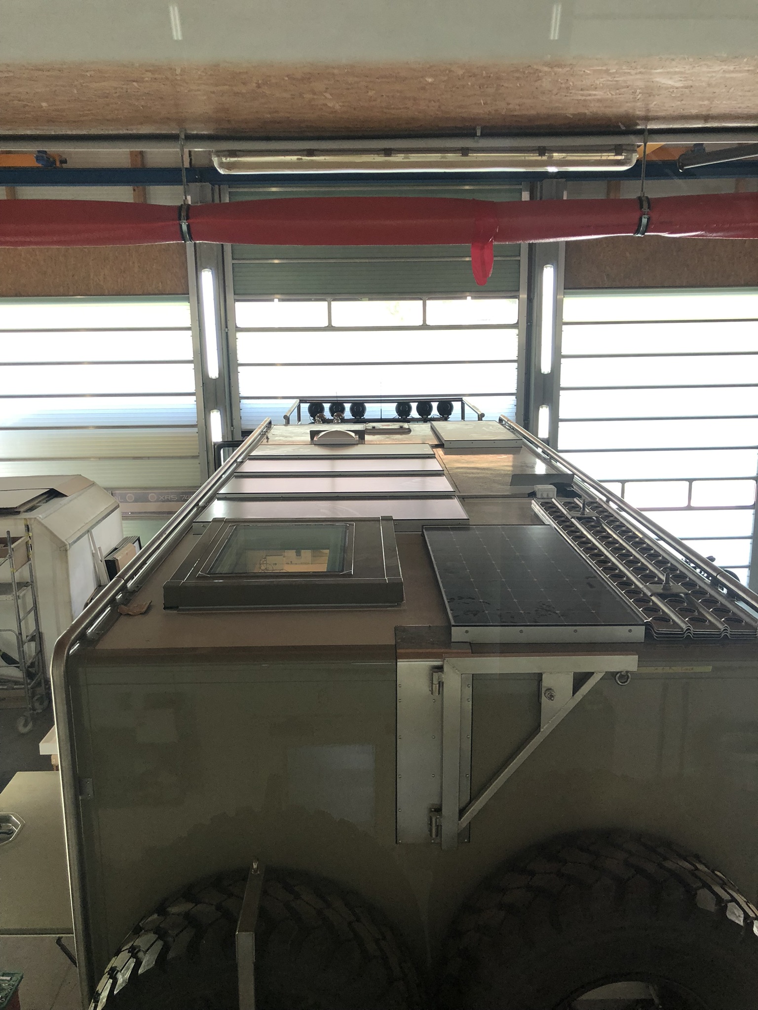 Ausschnitt Fahrerhaus, weiterer Ausbau Kabine, Elektrik und Sicherheit. Küchenplatten und Schubladeneinteilung.